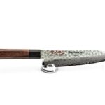 Cuchillo de cocina modelo Gyuto pequeño ideal para picar alimentos como vegetales, hortalizas, carnes y pescados, realizado en acero forjado en damasco de 55 capas martilleado a mano con mango de madera con virola de ébano y filo cerámico a mano.