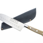 Cuchillo de cocina Santoku Simon PRO Micarta de 18 centímetros de hoja para cortar quesos o picar verduras de la serie de cuchillos de cocina Simón con mangos de micarta de lino con funda de piel incluida en cuero negro. Afilado a mano.