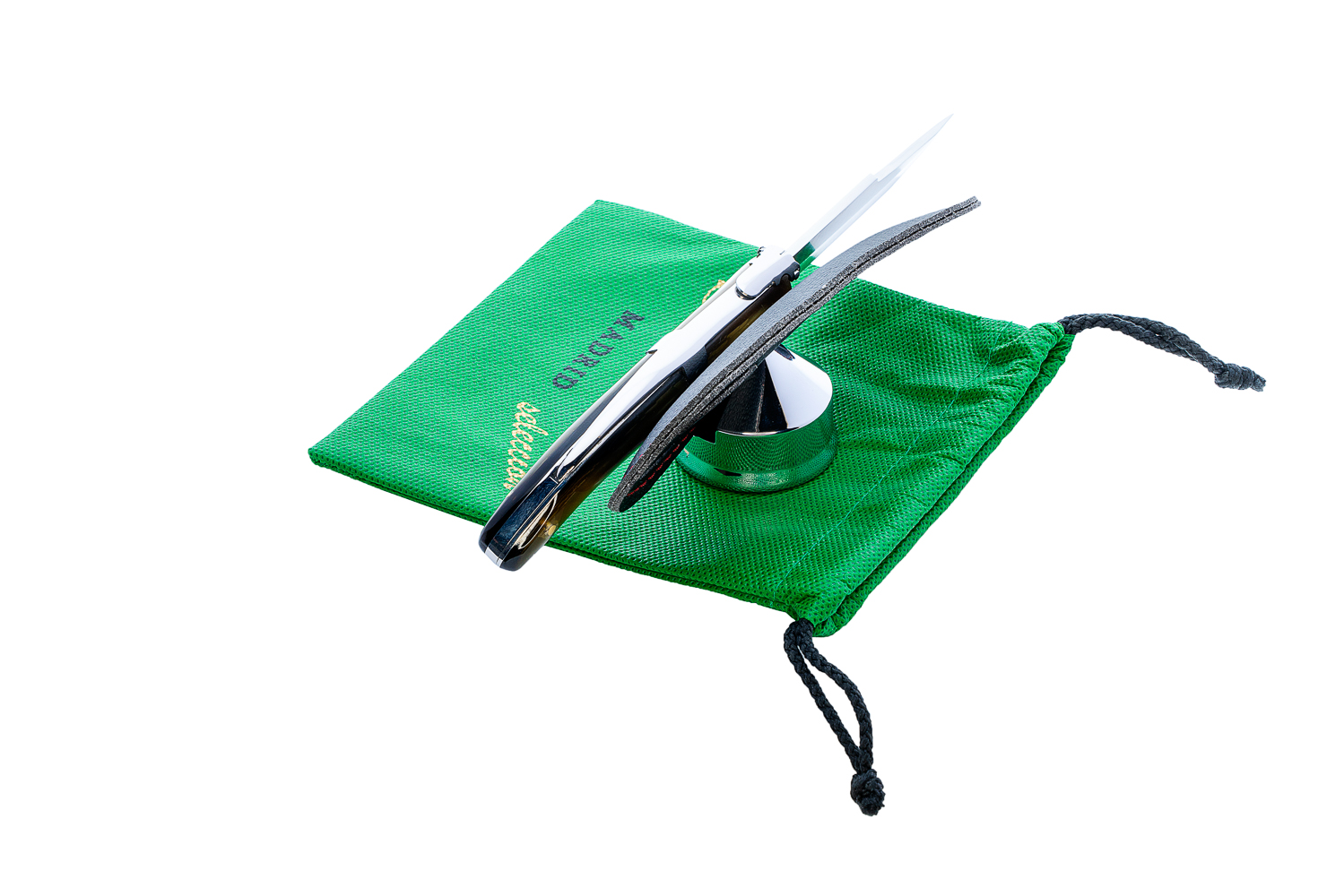 Navaja Clásica española realizada a mano con hoja en acero templado vaciada en acero cromo-vanadio con empuñadura en cuerno de toro auténtico saneado y trabajado a mano y muelle exterior liso en acero pulido tipo teja afilada a mano con piedra cerámica al agua con bloqueo clásico de palanquilla.